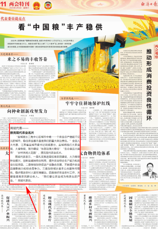 “鹽城是長三角中心區城市中唯一一個農業總產值超千億元的城市,穩住農業基本盤是我們的重大政治責任。”全國人大代表、江蘇省鹽城市委書記周斌表示,鹽城將踐行大農業觀、大食物觀,努力建設“東部沿海大糧倉”“生態食品大超市”“鄉村休閑大花園”,擦亮現代農業名片。