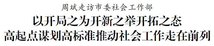 組建黨委社會工作部,是以習近平同志為核心的黨中央堅持和加強黨的全面領導、推進國家治理體系和治理能力現代化的重大舉措。市委堅決貫徹落實黨中央和省委決策部署,組建成立社會工作部。走訪中,周斌察看市委社會工作部辦公環境,與工作人員深入交流,了解大家崗位職責以及工作磨合情況,鼓勵要切實增強責任感、使命感、榮譽感,圍繞機構職能履職盡責,相互配合、促進融合、做好聯動,在新征程上展現新氣象、體現新擔當、作出新貢獻。