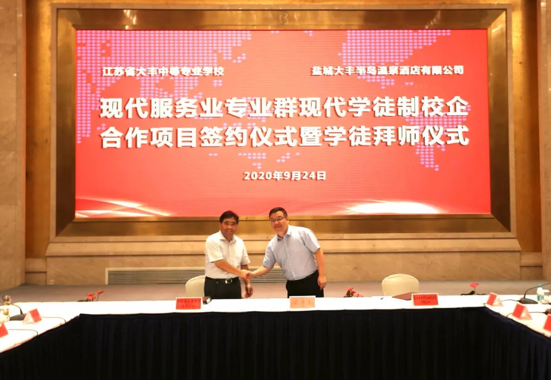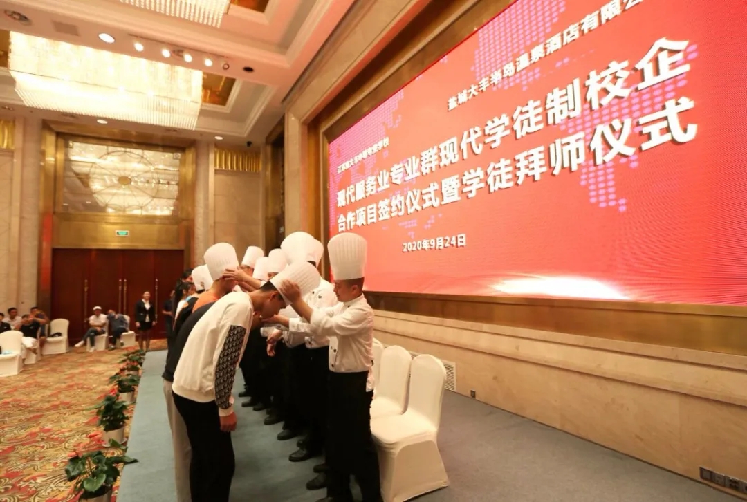 據悉,大豐中等專業學校和大豐港集團旗下半島溫泉酒店簽訂協議,雙方將共同探索建立校企“聯合招生、聯合培養、定向就業”的人才培養長效機制,為創新人才培養方式提供了一個嶄新平臺。通過合作,學校和企業進行優勢互補,實現資源共享。活動中,學校、酒店、家長、學生四方代表簽訂了現代學徒制工學交替跟崗實習協議,并舉行首批學徒制拜師儀式,23名學生順利拜師跟崗。