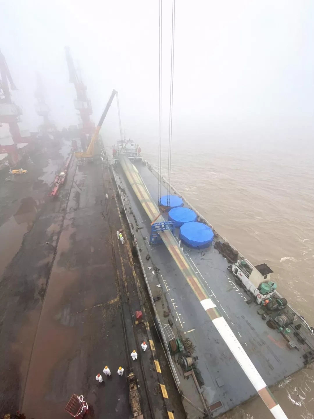 據(jù)悉,此前大豐港區(qū)吊裝的最長的風(fēng)電葉片是90米,為確保本次葉片的成功出運,碼頭吊裝團隊經(jīng)過多次推演和模擬練習(xí),最終采用了“門機+汽吊”協(xié)同抬吊的方式。“風(fēng)電葉片葉根部分重達50多噸,我們創(chuàng)新改變了之前的吊裝方式,利用500噸吊車吊裝葉根部分與碼頭門機吊裝葉尖部分相配合,成功吊運裝船。經(jīng)過測算,以這種協(xié)同抬吊的方式最為安全。”碼頭吊裝負責(zé)人介紹道。此次風(fēng)電葉片從起吊到裝運上船,整個過程持續(xù)不到20分鐘,充分展示了鹽城港大豐港區(qū)出色的重大件吊裝技藝。