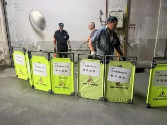 隨著防汛警報響起,物業應急小組迅速集結,攜帶防汛沙袋、防洪插板、抽水泵等物資設備趕赴西大門。各小組按照預案分工展開作業:搶險救援組兵分兩路,第一分隊使用專業工具快速搬運并組裝鋁合金防洪插板,在車庫入口處構筑起臨時擋水墻;第二分隊緊隨其后,用沙袋在插板后方疊筑“品”字形防洪墻,每層沙袋間用防水布加固,確保無滲漏縫隙。設備保障組同步啟動移動式抽水泵,對積水區域實施強排作業,同時安排技術人員對故障排水系統進行緊急搶修。全程通過智能廣播系統循環播放疏散提示,引導周邊居民有序撤離至臨時安置點。