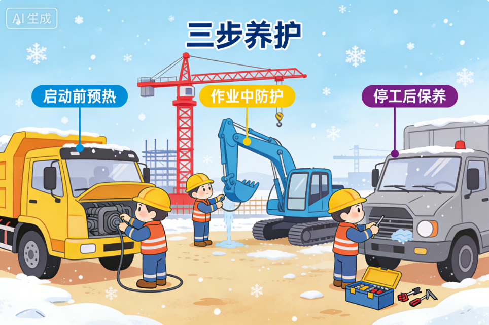 啟動前預熱:柴油車需更換-10℃或-20℃標號柴油,啟動前怠速預熱5—10分鐘,確保機油充分流動;液壓設備需檢查液壓油粘度,必要時更換冬季專用油。